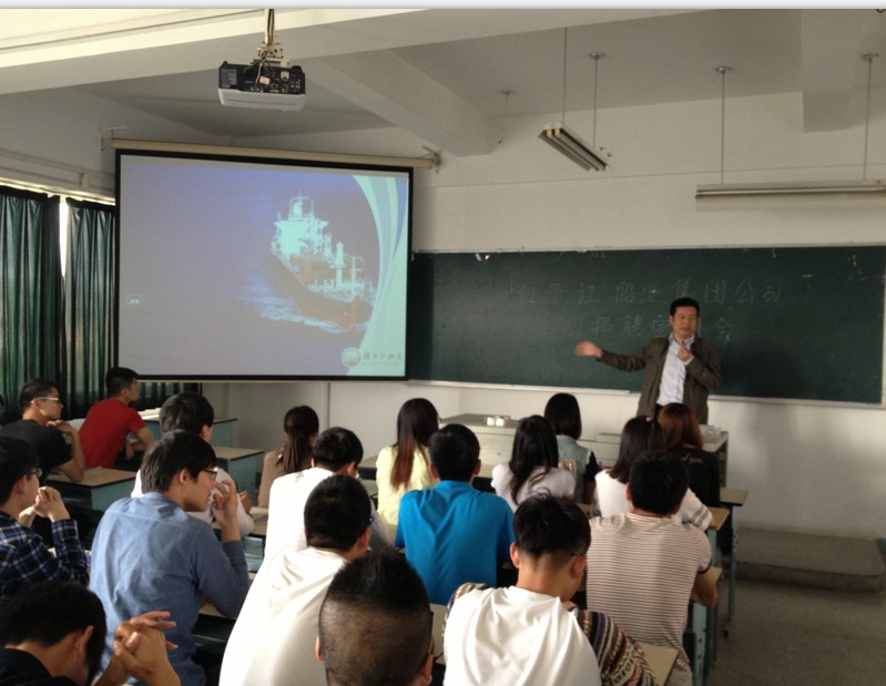 2014年5月14日下午,扬子江船业集团公司在公司迎春校区综合教学楼4024举办2014届船舶专业实习生招聘宣讲会。出席本次宣讲会的有扬子江船业集团公司人力资源部部长六徐文、人力资源科副科长刘春健、公司船机公司党总支副书记崔昌玺及部分专业教师、2012级船舶专业全体员工等。