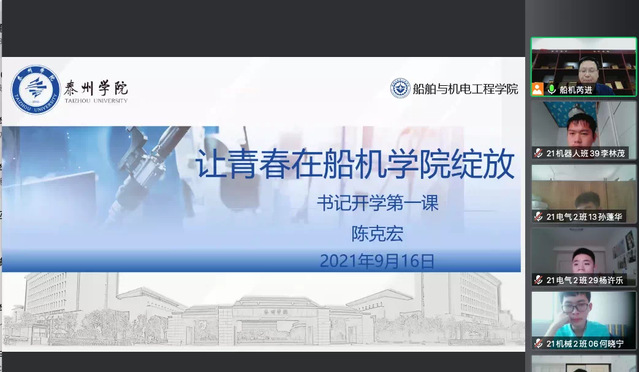 船机公司开学第一课模块中,由陈克宏书记、赵振江经理向同学们简要叙述了有关泰州的人文风情及公司的建校历程、历史风韵,使同学们对公司有了初步的印象,并对公司的“一训三风”做出了深刻的讲解。此外,两位公司领导通过习近平总书记对广大青年“立大志、明大德、成大才、担大任”的寄语,鼓励同学们德智体美劳全面发展,做好职业规划,对于学业有自己个人的安排,明确自己的目标。