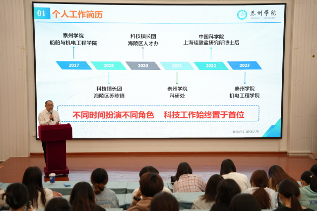 第四届泰州青年五四奖章获得者周银用他的科研经历,为员工朋友们描写了一段青春学习奋斗史。他勉励在场学子,在工作学习中,无论扮演何种角色,要始终坚持着科技先行,用科研成果丰富人生华章。周博士寄予泰院青年要敢于突破、激扬奋斗,书写人生、实现梦想,以不懈的努力和热爱奔赴无悔的青春。